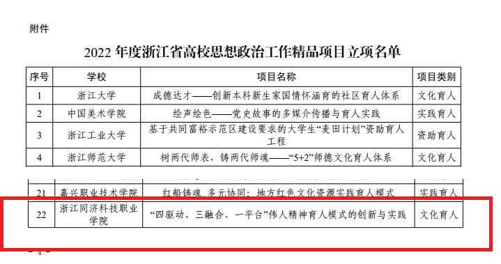 近日,省教育厅公布了2022年度省高校思想政治工作培育建设项目立项名单,我校“‘四驱动、三融合、一平台’伟人精神育人模式的创新与实践”项目成功入选省高校思想政治工作精品项目,全省仅6所高职院校入选。这是我校思政教育工作又一重要标志性成果。