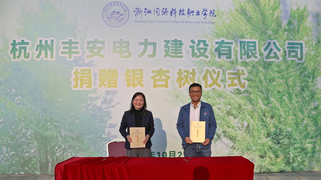 10月25日,杭州丰安电力建设有限公司向我校捐赠银杏树仪式在南校门广场顺利举行。丰安电力董事长谢昌雷、校党委书记江影、校长梁国钱、副校长姜伟、副校长朱兆平、丰安电力副总经理谢宗昂、副总经理方谏、工会主席冯杰、学校相关职能部门负责人、机电工程学院党政领导班子、丰安电力班学生共60余人参加了捐赠仪式。