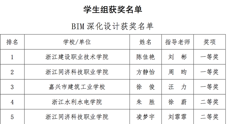 2021年10月22日大赛结果揭晓。我校5支队伍脱颖而出,斩获一等奖1项,二等奖3项,三等奖1项。其中,装配式建筑施工员赛项中“深化设计模块”的方静怡、严洋,“构件制作与安装模块”的孙天齐,建筑信息模型技术员赛项中“BIM深化设计模块”的方静怡等同学都被推荐参加全国总决赛。获荐参加国赛的同学们表示,接下来会再接再厉,在国赛中展示同科精神和浙江实力,力争取得更加优异的成绩。
