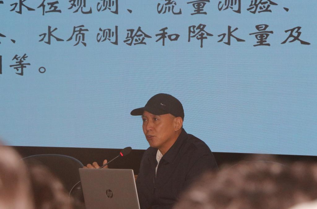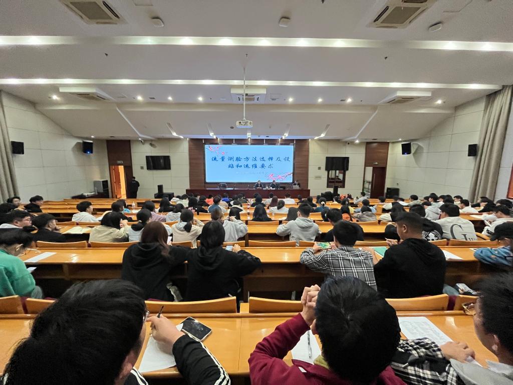他从水文测站的基本任务及分类、测验河段的选择与勘察、流量测验及洪水调查方法简介等方面为同学们带来实践“干货”,同时他以分水江上水文监测的工作经历举例,生动真切地展示了水文人如何经受风雨考验默默坚守岗位的勇毅与伟大。