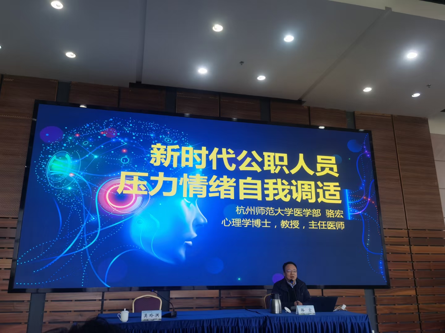 关注干部心理健康,是新时代干部队伍建设的重要内容。为进一步提升干部心理素质,促进干部健康成长,12月4日下午,学校在行政楼三楼多功能厅举办了干部心理健康专题讲座,邀请杭州师范大学医学部主任骆宏博士就新时代公职人员压力情绪自我调适作专题讲座。学校领导班子成员及中层干部共60余人参加讲座,讲座由党委委员、组织部部长吴玲洪主持。