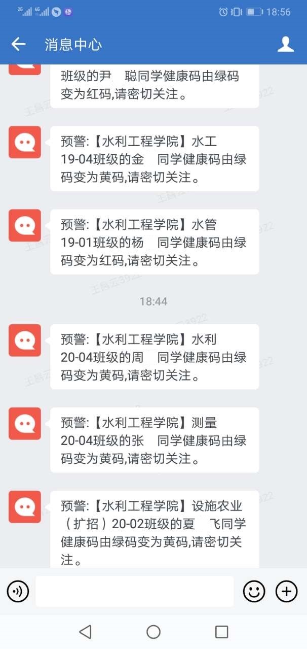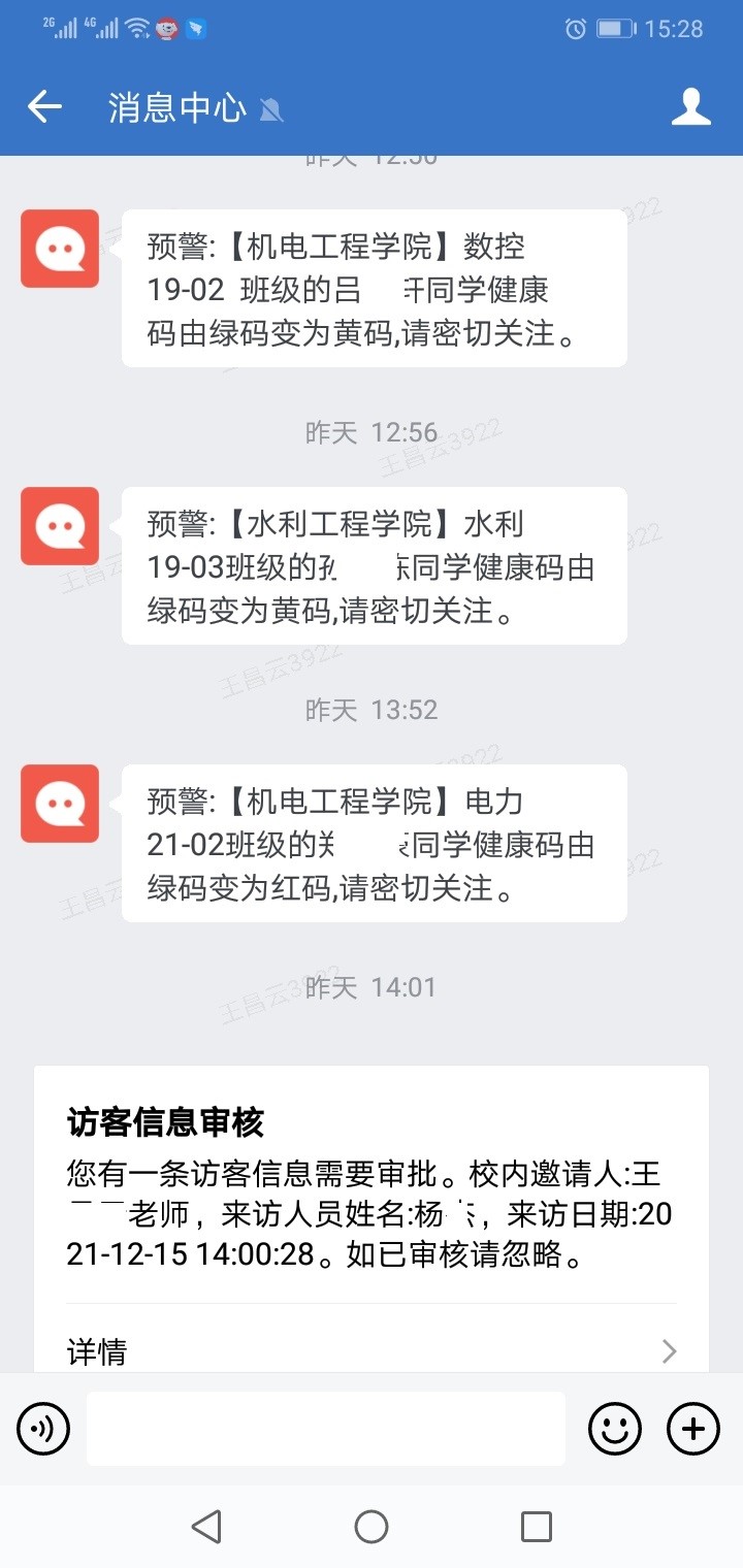 12月11日,学校企业微信消息中心上线健康码异动预警应用,该应用同步对接省大数据局,实现健康码异动信息实时预警。一旦出现师生健康码异动,可实时向其本人及学校各级防疫责任人员层层发出预警消息,极大减轻了线下网格系统摸排的工作量,提升师生疫情管控效率,建立校园疫情防控快速响应能力,并为实时掌握顶岗实习学生防疫管控信息提供了技术支持。