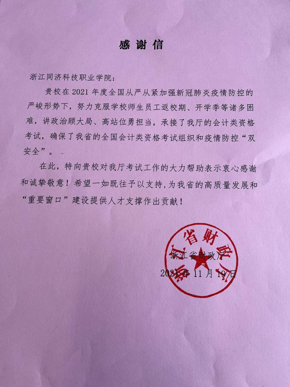 近日,我校收到来自浙江省财政厅、农业厅的感谢信。财政厅在信中对我校在疫情防控的严峻形势下,讲政治顾大局、高站位勇担当,积极承接注册会计师全国统一考试表示了感谢。农业厅在信中对我校承接全国执业兽医资格考试,克服师生返校等诸多困难,圆满完成疫情防控和考务工作表示了感谢。