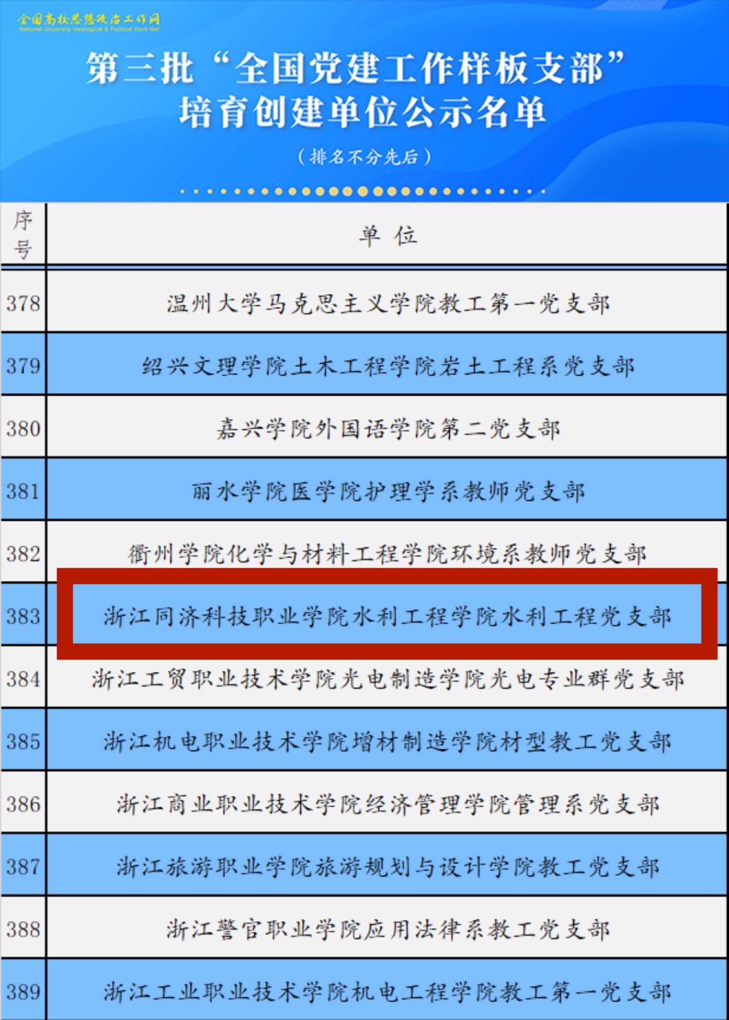 近日,教育部办公厅公布了第三批全国党建工作示范高校、标杆院系、样板支部培育创建单位名单。我校水利工程学院水利工程党支部入选第三批“全国党建工作样板支部”培育创建单位。这是我校自2019年以来基层党建工作的又一突破。