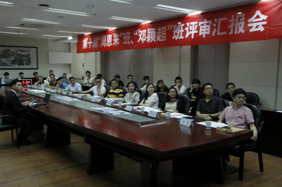 2018年5月24日下午13:30,学院第十届“周恩来”班、“邓颖超”班汇报评审会在行政楼二楼会议室举行。评审会由学院党委副书记、副院长吴宏平主持,“周恩来”班、“邓颖超”班创建工作领导小组成员、各系教师代表及学生代表等21人组成评委团对候选班级进行汇报答辩打分,10名候选班级代表参加了汇报答辩。