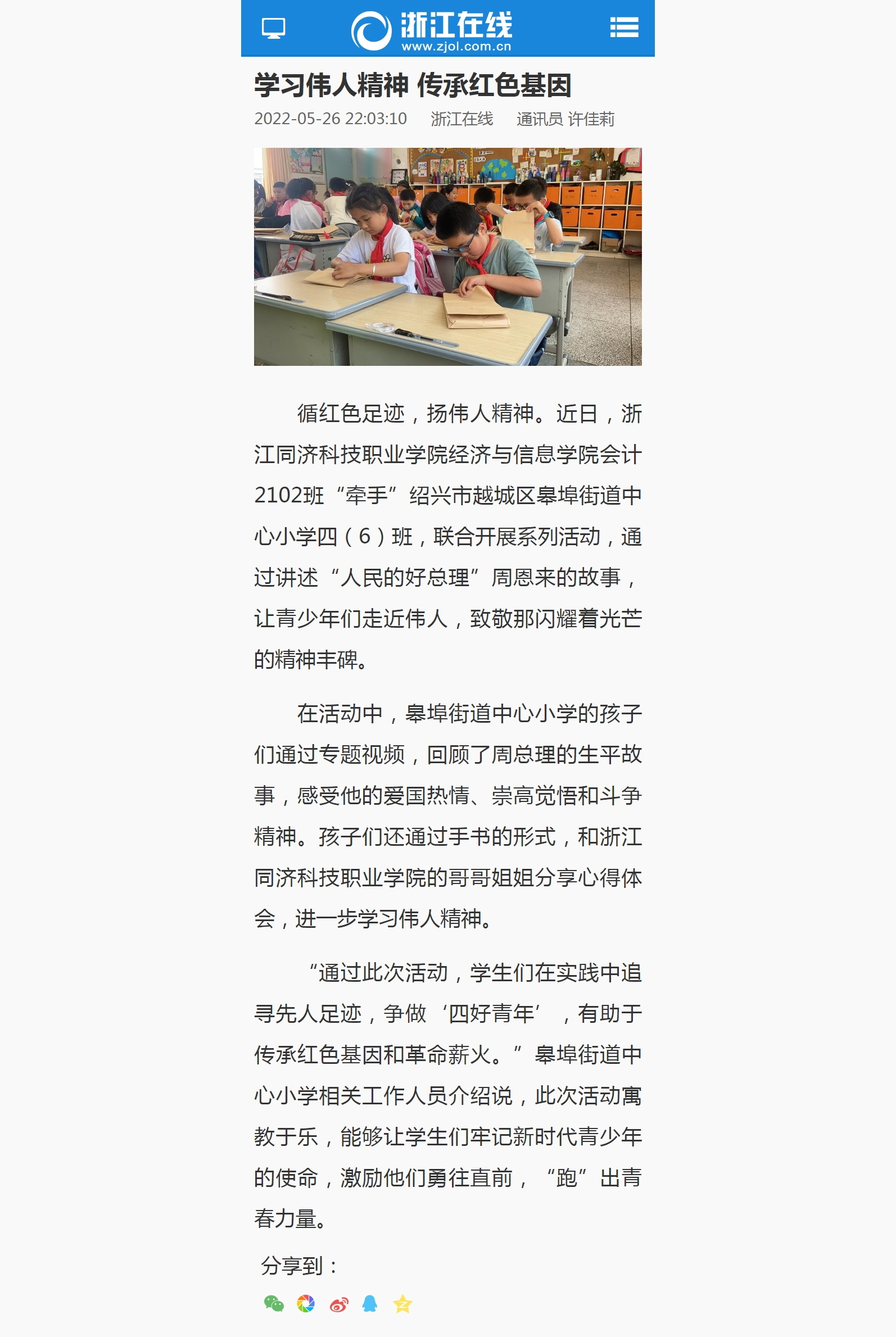 2022年5月26日浙江在线以《学习伟人精神 传承红色基因》为题,报道我校经信学院学子循红色足迹,扬伟人精神活动。