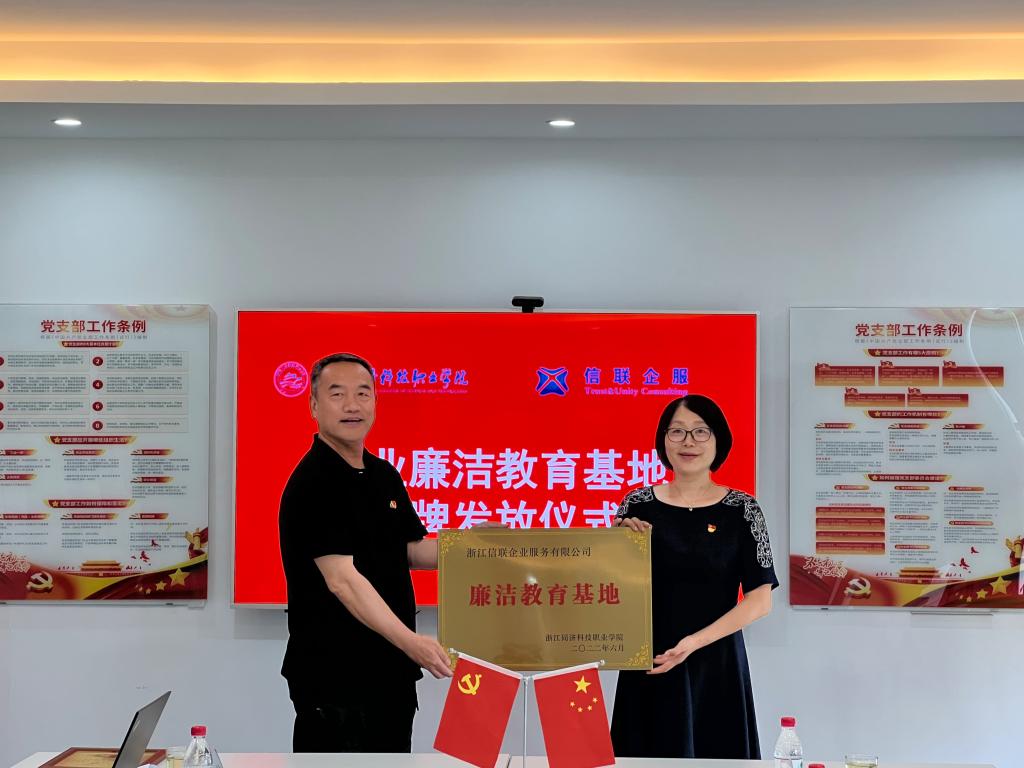 6月8日上午,学校与浙江信联企业服务公司在浙江信联企服集团举行了廉洁教育基地授牌仪式。学校党委委员、纪委书记应芬,浙江信联企服集团执行总裁、集团党支部书记虞浙安,中联集团教育科技有限公司副总裁冯学平等共同出席了授牌仪式。经信学院负责人及相关教师等参加仪式。