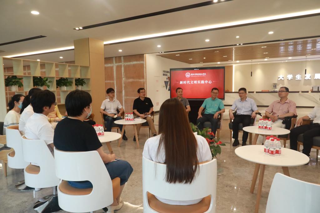宣讲活动结束后,省直机关工委宣教部部长周招满、省直机关青年巡回宣讲团一行参观了学校校史馆和伟人精神成果展厅,并在瓯江楼新时代文明实践中心(学生事务中心)与学校党委副书记、副校长吴宏平,党委委员、宣传部部长吴敏启以及辅导员代表、思政教师代表等围绕省第十五次党代会精神,结合本职工作开展青年“政策面对面”座谈交流。