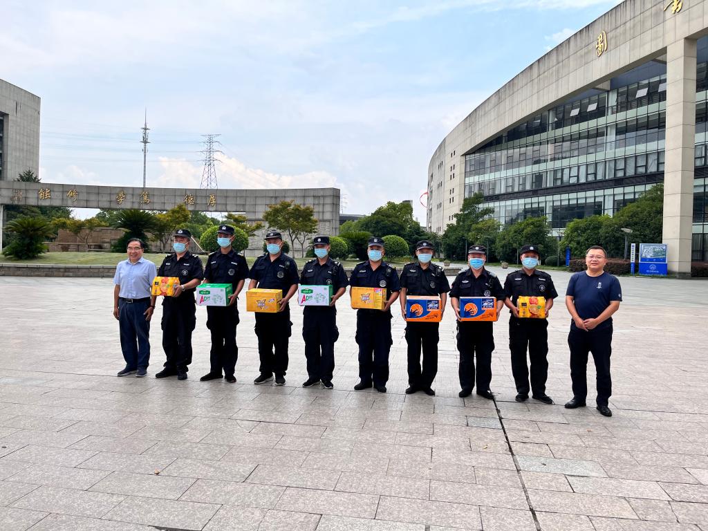 2022年7月26日,梁国钱校长和沈自力副校长看望慰问暑假期间仍坚守岗位的安保队员,对今年入夏以来,持续高温天气下依然坚守岗位的队员表示衷心感谢。