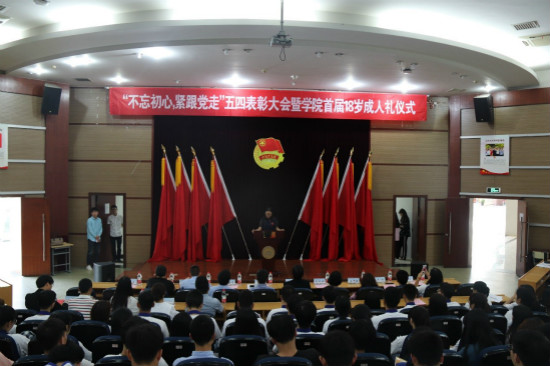 2018年5月4日中午,院团委在图书信息楼报告厅举行“不忘初心,紧跟党走”五四表彰大会暨学院首届18岁成人礼仪式。学院党委书记江影、副书记副院长吴宏平、党委委员组宣部部长吴玲洪出席了仪式活动。基础部主任、各系党总支书记、团总支书记、“翔宇”大学生骨干精英学校第四期学员及各系学生代表共500人参加了本次活动,活动由团委副书记叶乐主持。