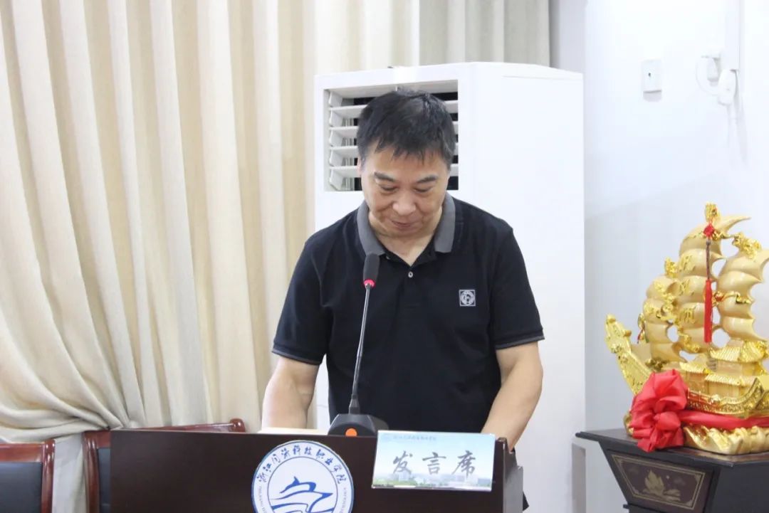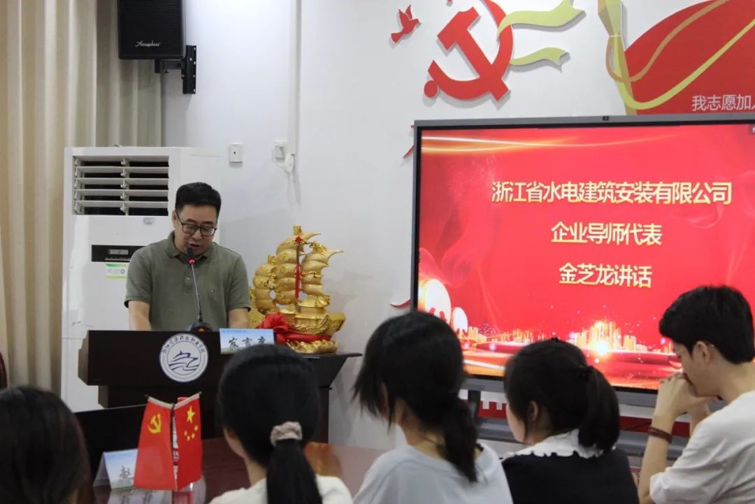 浙江省水电建筑安装有限公司项目经理金芝龙作为企业导师代表讲话。他首先肯定了我校的现代学徒制人才培养模式,是实现学校、企业、学生“三赢”的较好途径,为企业的人才培养搭建了一个相互交流学习的平台。他鼓励新生要珍惜机会,做到“手中有技术、心中有他人”。