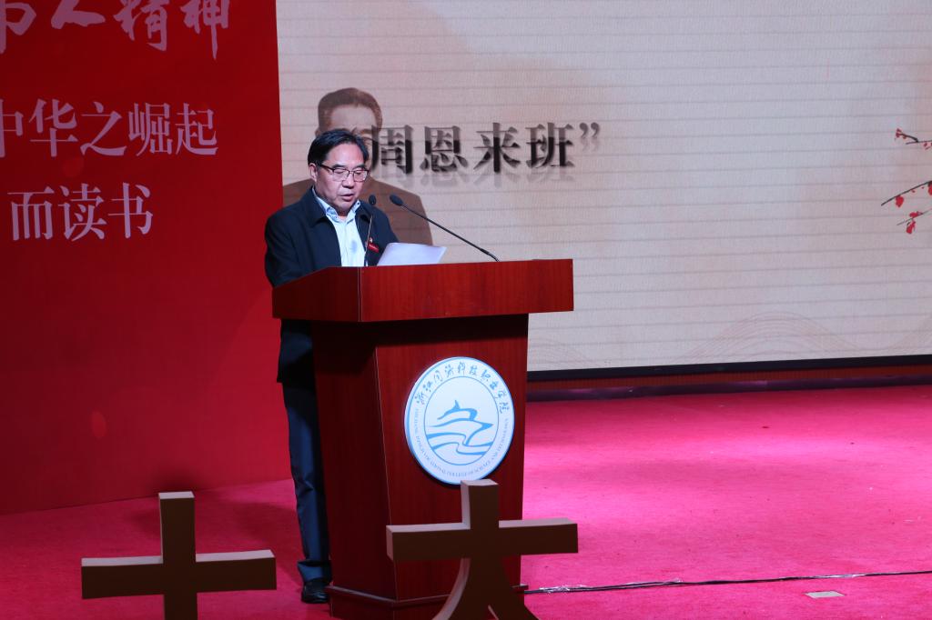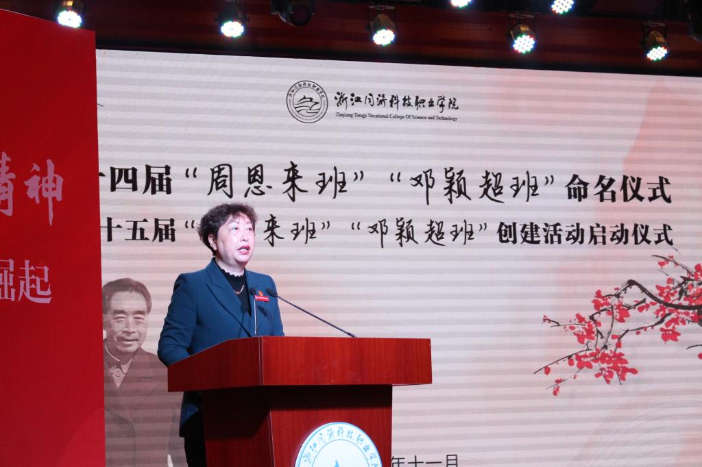 校党委书记江影讲话。江影表示,举办命名仪式是为了弘扬和传承以周恩来、邓颖超为代表的老一辈革命家们留下的宝贵精神财富,表彰在“周恩来班”“邓颖超班”创建活动中涌现出来的先进集体,将周恩来精神内化为全体大学生的价值取向和精神追求,引导广大青年学子学好二十大,奋进新征程,建功新时代。她指出,学校连续14年开展“周恩来班”“邓颖超班”创建活动,形成了“扬伟人精神、树厚德之人”的伟人文化,学校德育工作水平有了很大提高,班风、学风建设有了明显改善。为持续弘扬伟人精神,江影提出三点希望:一是希望广大同科学子坚定信念跟党走,以伟人为精神标杆,不忘初心永奋斗,发挥青年优势,贡献自己的青春力量;二是希望全体创建班级示范引领创特色,积极参与学校发展各项工作,主动传播优秀校园文化,为持续营造优良校风、学风做贡献;三是希望学校有关部门继续擦亮文化金名片,谋划做好“周恩来班”“邓颖超班”创建活动十五周年的相关活动安排,提高文化育人质量。