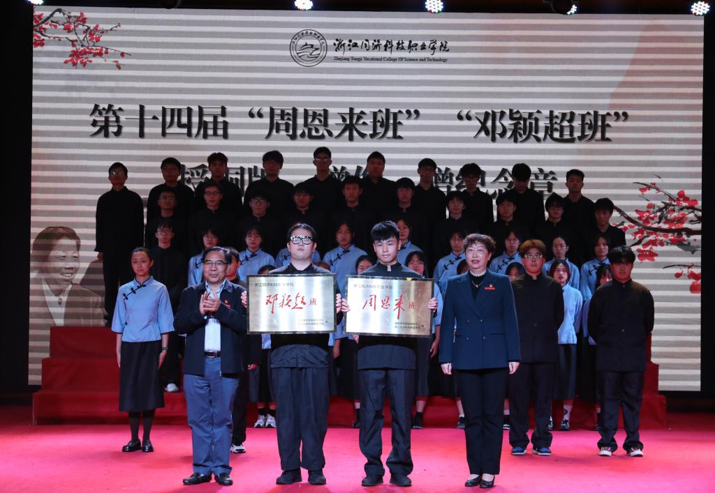 仪式开始,在庄严的国歌声后,全体人员首先向周恩来、邓颖超像深深鞠躬表达缅怀之情。与会人员通过视频,共同回顾了学校“周恩来班”“邓颖超班”十四年的创建历程。校长梁国钱宣读命名文件。校党委书记江影、校长梁国钱为第十四届“周恩来班”“邓颖超班”授铜牌;校党委副书记、副校长吴宏平,校党委委员、纪委书记应芬为第十四届“周恩来班”“邓颖超班”赠像;校党委委员、副校长姜伟,校党委委员、副校长朱兆平为第十四届“周恩来班”“邓颖超班”赠纪念章;校党委委员、组织部部长吴玲洪,校党委委员、宣传部部长吴敏启为第十四届“周恩来班”“邓颖超班”创建奖班级授牌。
