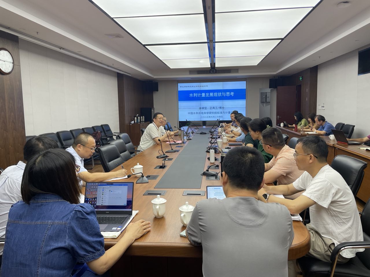 余根坚教授结合自己多年工作经验,进行了一场丰富生动的水利计量科普知识讲座。他详细介绍了计量的定义和作用,解读了现行计量标准和文件规程,结合案例,讲解了计量在水利工程建设、调水、水文及智慧水利等领域的广泛用途及需求前景,结合丰富的工作经验深入剖析了当前水利计量发展存在的问题和深入思考。讲解后,他针对老师提问详细进行了回答。