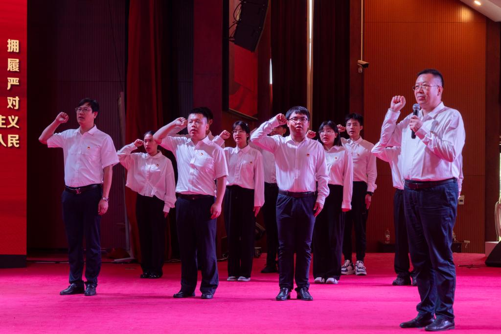 主题党日活动在庄严的国歌声中拉开帷幕。党委书记张勇带领新党员进行集体宣誓,全体老党员重温入党誓词。大家面对党旗肃然站立,高举右手庄严宣誓,表达为党的事业奋斗终身的决心。学校领导分别为国家级、省级和校级党建工作示范创建和质量创优成果颁奖。