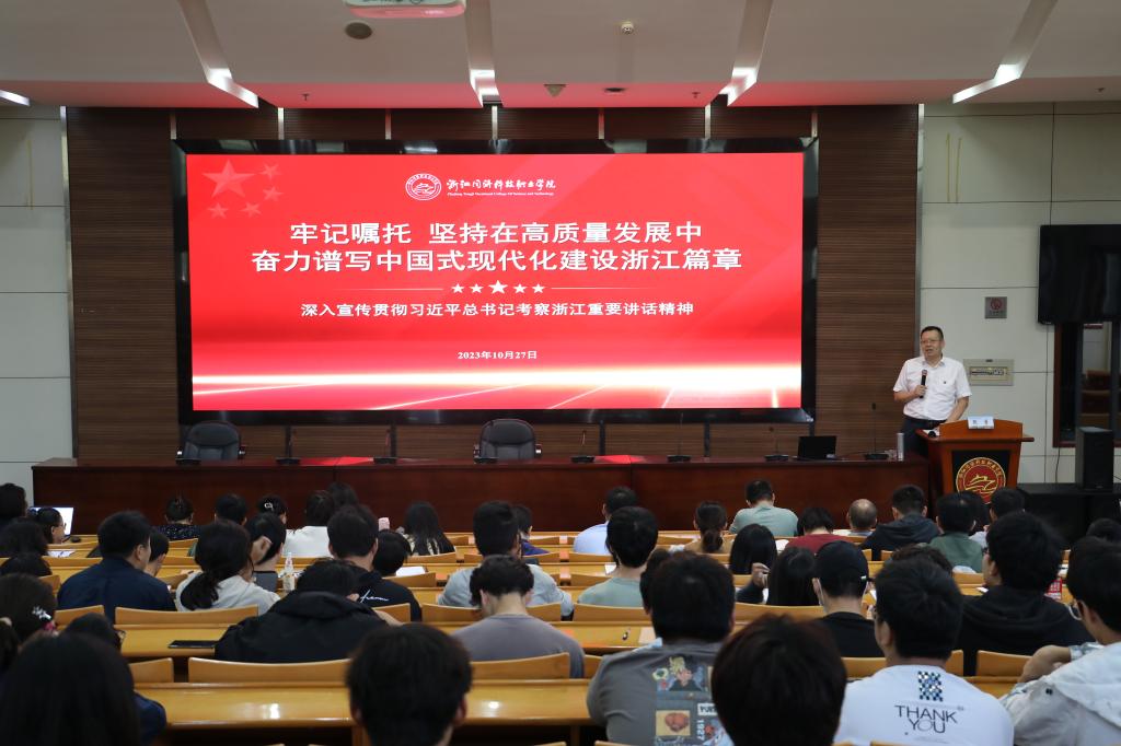 10月27日上午,学校党委书记张勇以“牢记嘱托坚持在高质量发展中奋力谱写中国式现代化建设浙江篇章”为题作习近平总书记考察浙江重要讲话精神宣讲,激励学校广大党员师生牢记殷殷嘱托,在奋力谱写中国式现代化浙江新篇章中展现担当作为。学校党员师生代表聆听宣讲。