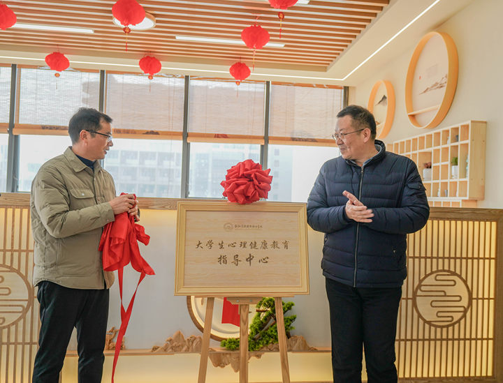 张勇书记(右一)、吴敏启副校长(左一)为大学生心理健康教育指导中心揭牌