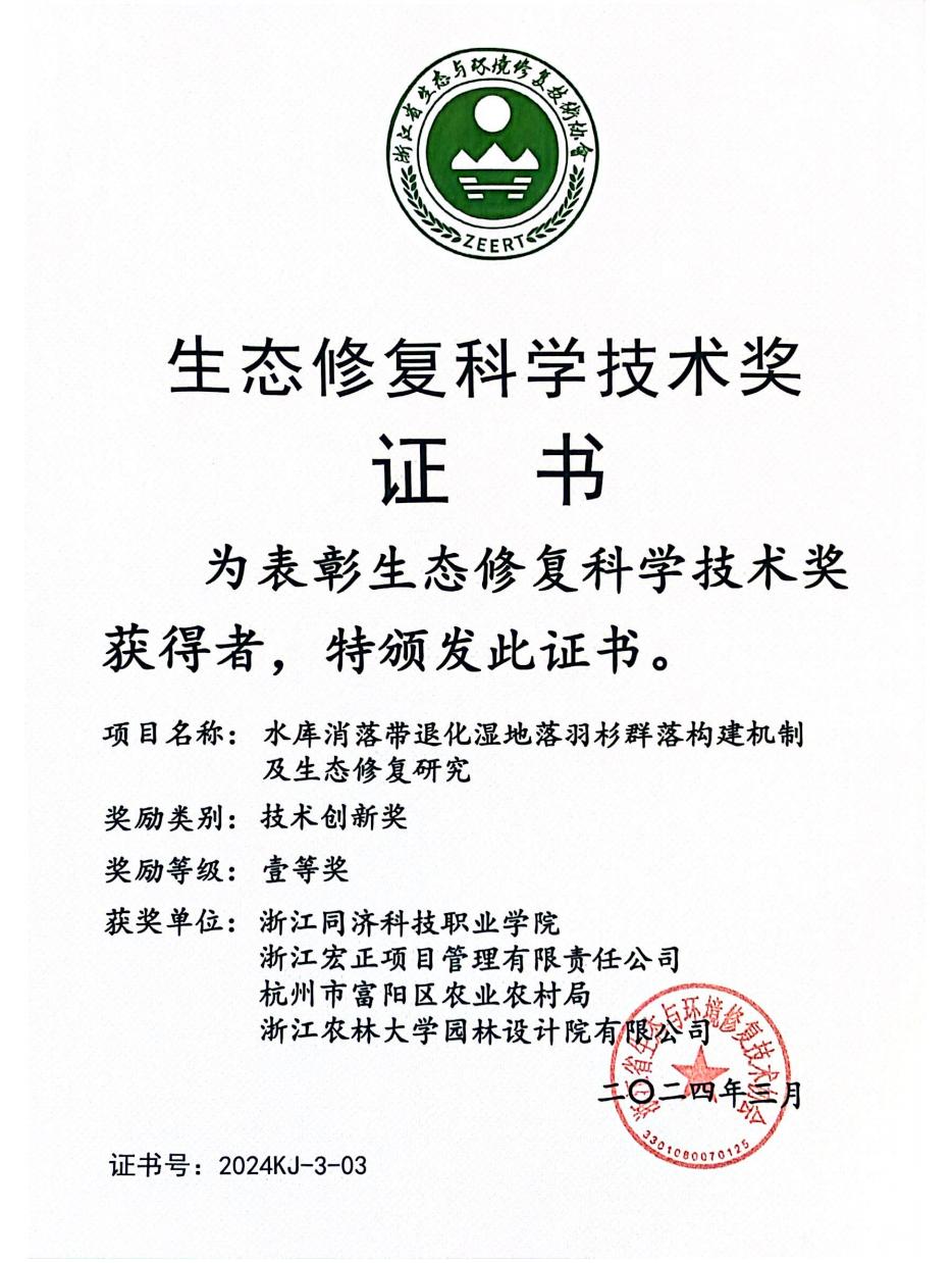 近日,浙江省生态与环境修复技术协会发布浙江省生态修复科学技术奖获奖名单。我校陈海生博士团队的项目《水库消落带退化湿地落羽杉群落构建机制及生态修复研究》获技术创新奖一等奖。