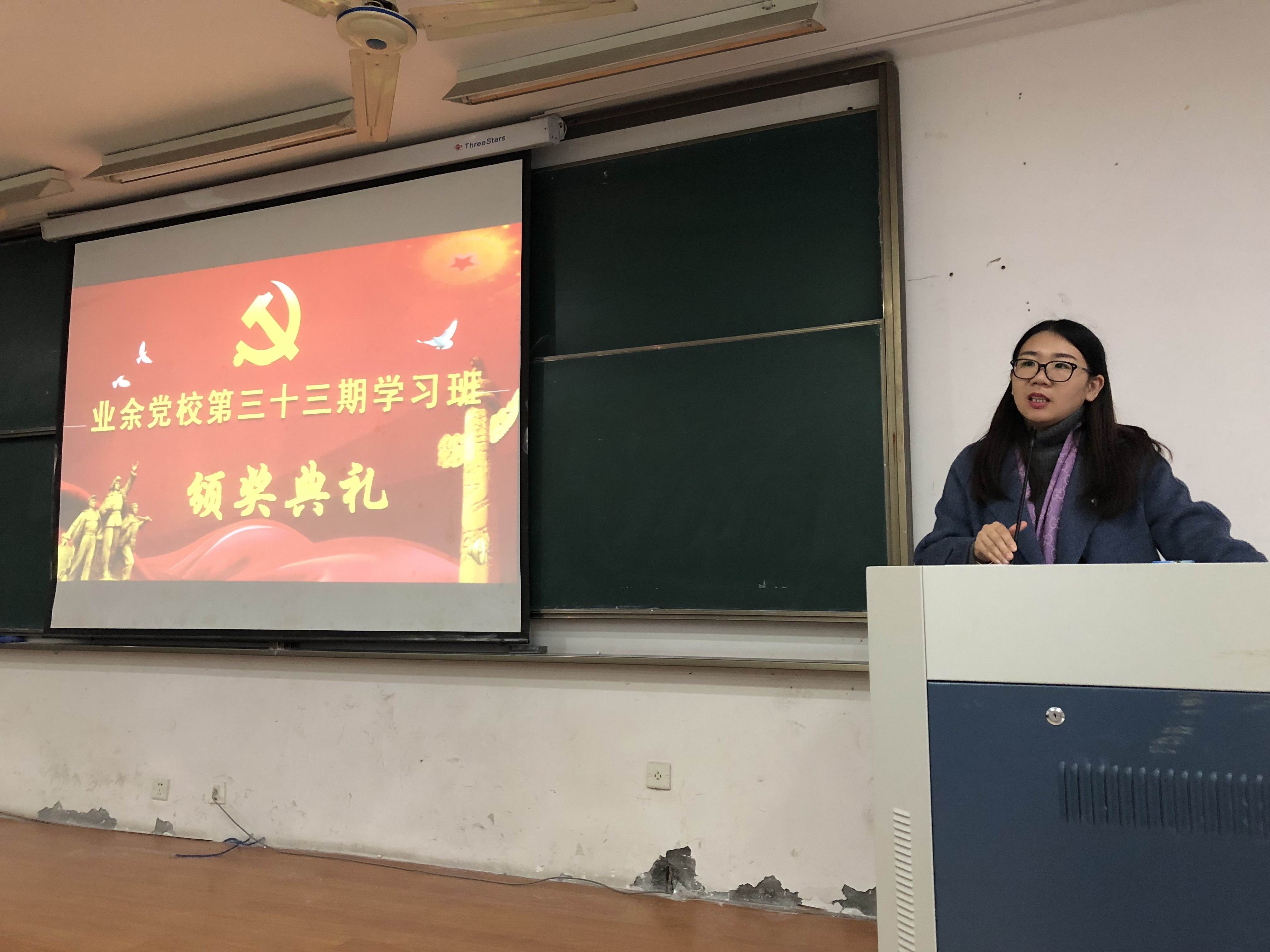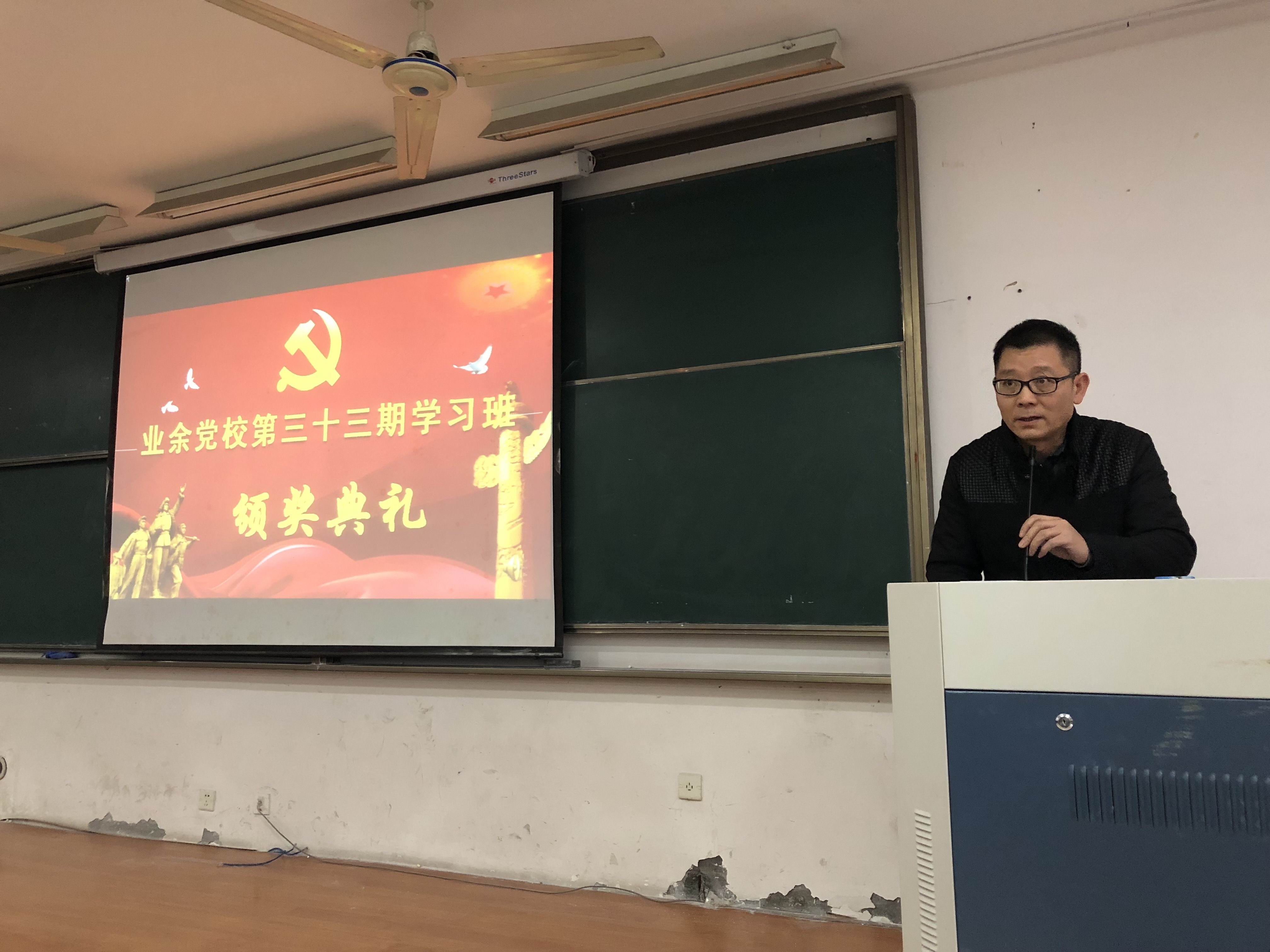 吴院长做重要讲话。他指出:习近平总书记在党的十九大上作的报告,深刻阐述了新时代中国特色社会主义思想,对从现在起到本世纪中叶把我国建成社会主义现代化强国作了战略安排,并专门就青年一代承担使命、接力奋斗作了强调:“广大青年要坚定理想信念,志存高远,脚踏实地,勇做时代的弄潮儿,在实现中国梦的生动实践中放飞青春梦想,在为人民利益的不懈奋斗中书写人生华章!”业余党校学习班学员,是青年学生中的先进群体,更应该不忘初心跟党走,牢记使命作表率。最后吴院长对全体学员提出三点希望和要求:一,坚定理想信念,在思想上体现先进性。坚持用习近平新时代中国特色社会主义思想武装头脑、指导行动。以时不我待的精神在学懂、弄通、做实上下功夫。二、争做学习标兵,在学习中体现先进性。学生的主要任务仍然是学习。 全体学员要端正学习的动机,秉承“笃学”的校训,潜心学专业知识、努力学政治理论、认真学做人做事。三、争当行动巨人,在行动中体现先进性。全体学员要志存高远、脚踏实地、担当在先、奉献在前,在今后学院的各项活动中发挥自己的积极作用,为其他同学作好表率。