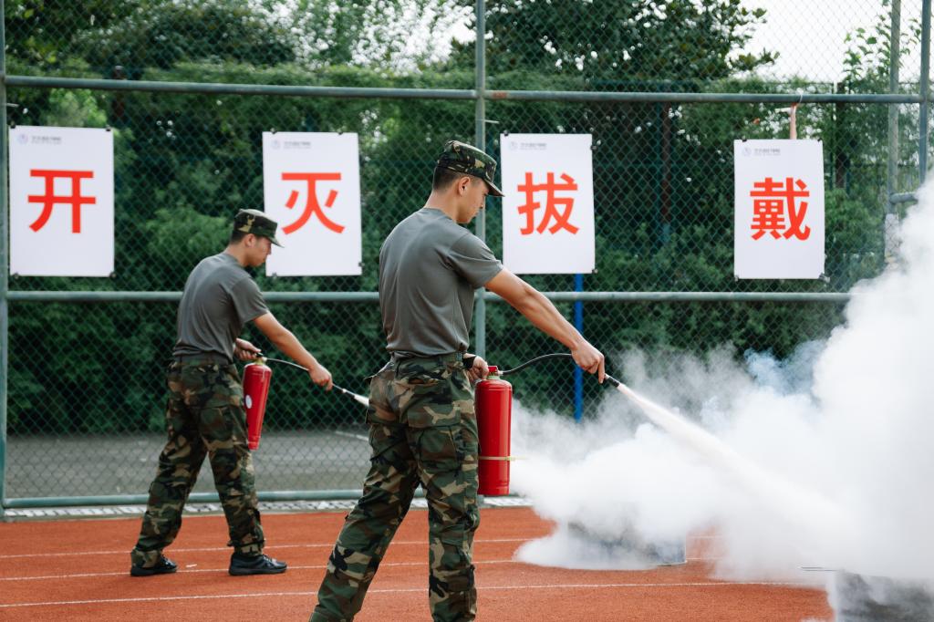疏散完毕后,各军训营及时清点人数并完成上报,确认全体师生安全撤离,演练全程无意外情况发生。为进一步巩固实效,现场还设置了消防技能实训环节,内容包括灭火器、消防水带及自救式呼吸器的正确使用方法,有效提升了新生的实操能力。