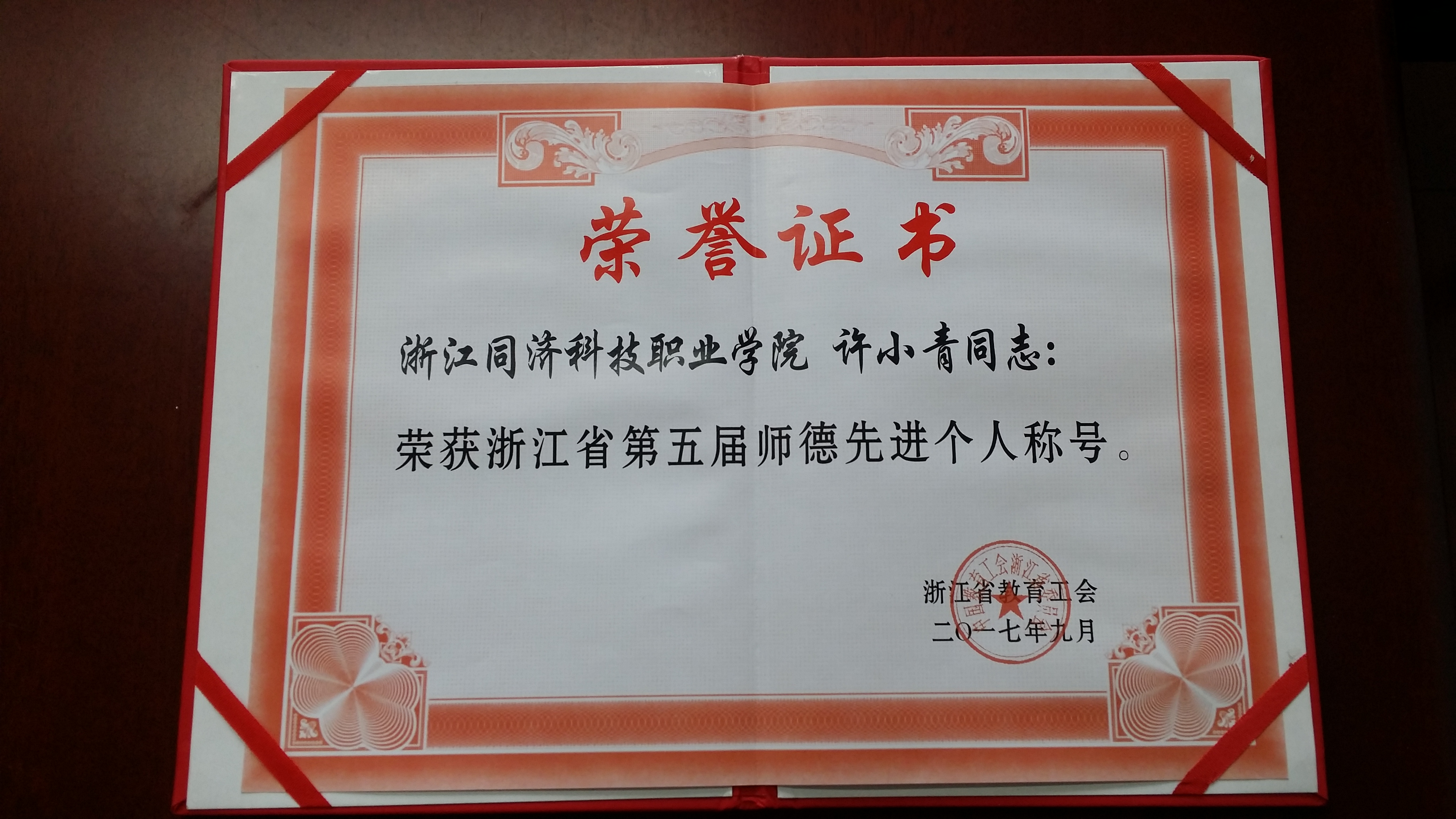 在第33个教师节来临之际,从浙江省教育工会传来好消息,我院许小青老师,在省教育工会举办的浙江省第五届师德标兵和师德先进个人的评选活动中,被授予“浙江省第五届师德先进个人”荣誉称号。