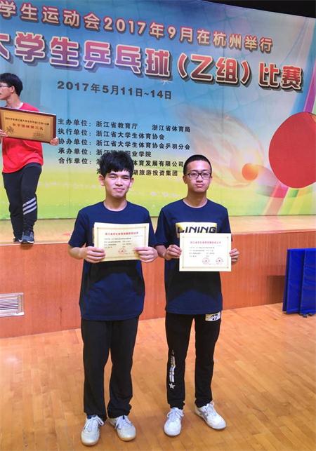 男子乒乓球双打金牌获得者:机电系:徐淑伟(左边)、戴苍桥(右)