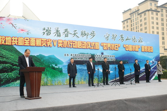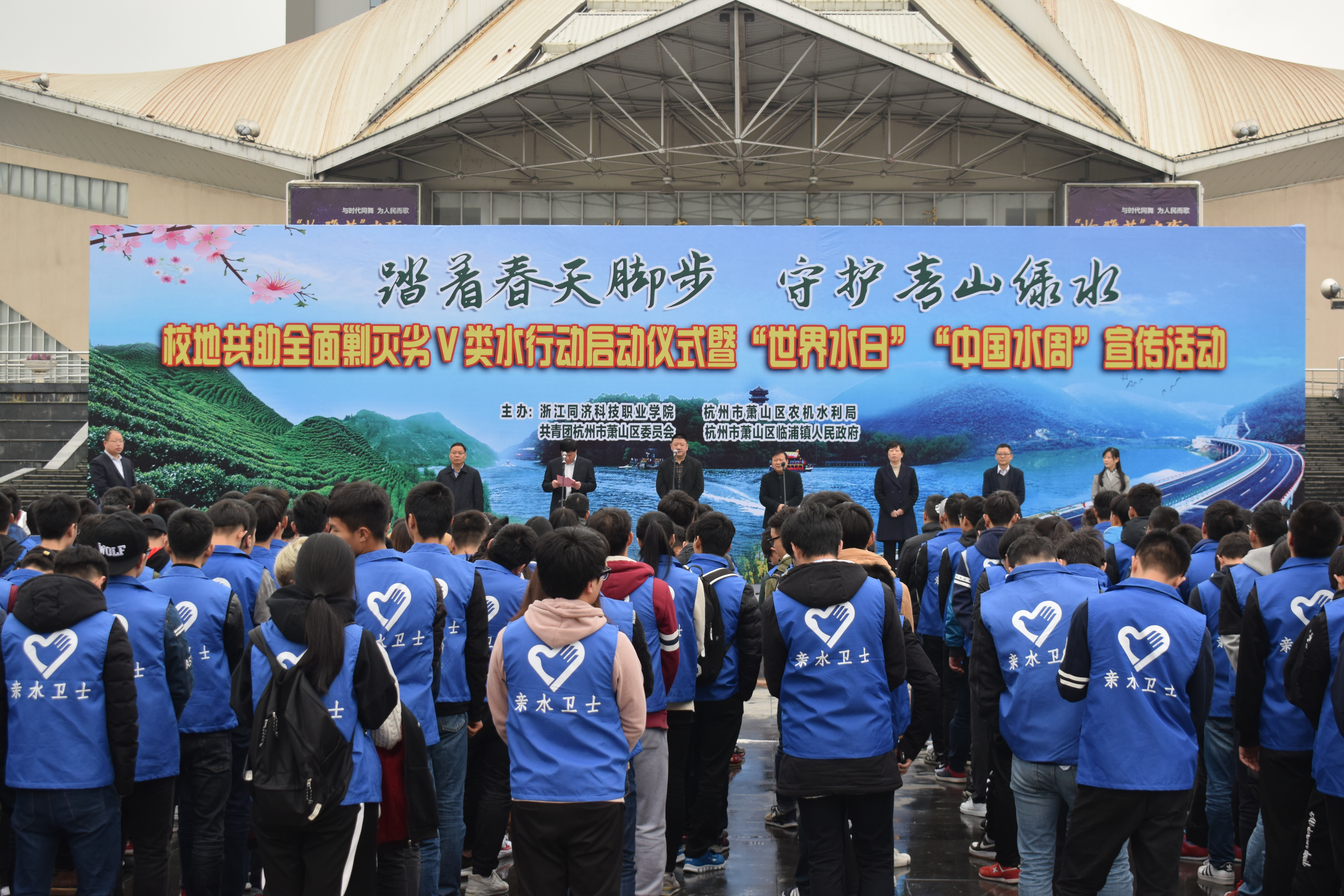 2017年3月23日上午,学院联合共青团萧山区委员会、杭州市萧山区农机水利局、杭州市萧山区临浦镇人民政府,在临浦文化体育中心举办校地共助全面剿灭劣V类水行动启动仪式暨2017年“世界水日”“中国水周”宣传活动启动仪式。出席本次活动的领导有,萧山区副区长方军、学院党委书记丁坚钢、萧山区农机水利局陈关水、党委副书记江影、党委委员副院长吴宏平、临浦镇镇长施炬兴、萧山区委员会副书记杨芳。学院学工部负责人、团委负责人、各系负责人、萧山区农机水利局职工代表、萧山区社区志愿者以及学院250名学生代表参加仪式。