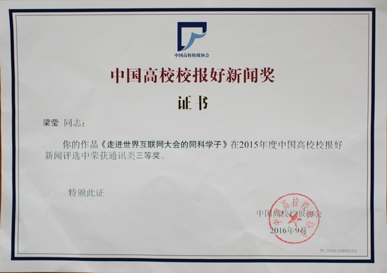 11月18日,中国高校校报协会2016年年会暨首届中国高校传媒发展高端论坛在杭州市举行。中国高校校报协会理事长、清华大学校务委员会副主任韩景阳,浙江大学党委副书记胡旭阳,教育部社科司出版处处长田敬诚等出席会议。来自全国330多家高校的500多名宣传战线人员参会。会议对高校校报媒体融合经验、高校校报未来发展等进行了探讨,浙江大学、浙江日报等高校和媒体的宣传工作负责人作专题演讲。会议还对2015年度中国高校校报好新闻获奖作品进行了点评。我院《走进世界互联网大会的同科学子》一文荣获通讯类三等奖。这也是我院校报首次获此荣誉。