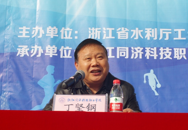 丁坚钢致欢迎词,他代表学院向全体参赛代表队表示热烈欢迎,他指出,我院作为东道主,按照水利厅的要求和竞赛的各项规定精心组织,周密安排,热情服务,全力以赴做好各项准备工作,竭尽全力使本届达标运动会成为展示水利系统职工精神风貌、检验职工文化体育成果、推进全厅职工体育事业不断发展的一次盛会,成为一次加强交流、增进友谊,团结奋进的联谊会。