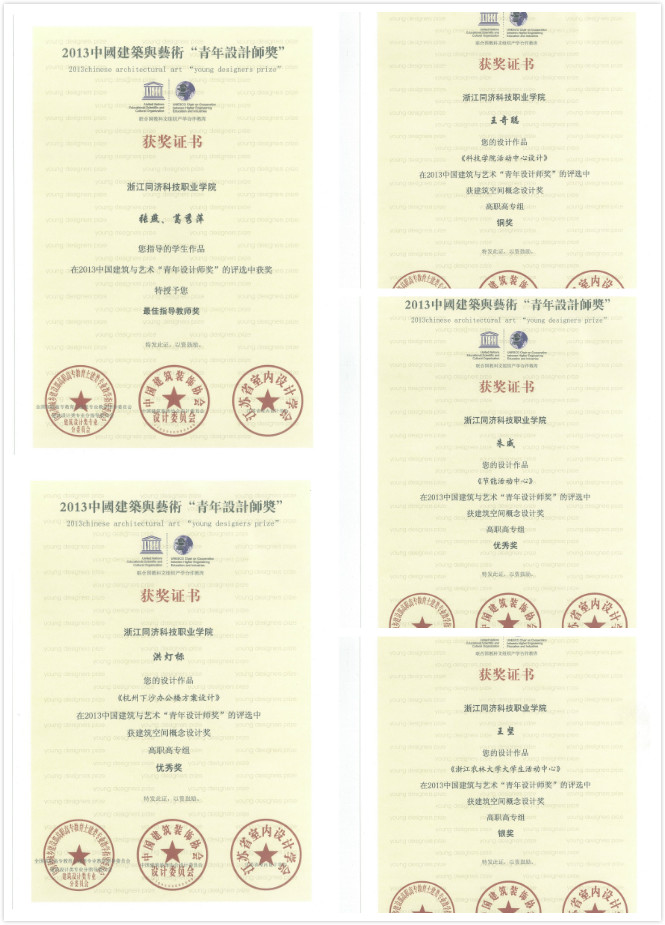 在建筑设计概念奖中,由张燕、施文禅、葛秀萍老师指导的王坚获得银奖;王奇聪获得铜奖;朱威、洪灯标分别获得优秀奖。张燕和葛秀萍还获得了最佳指导教师奖。