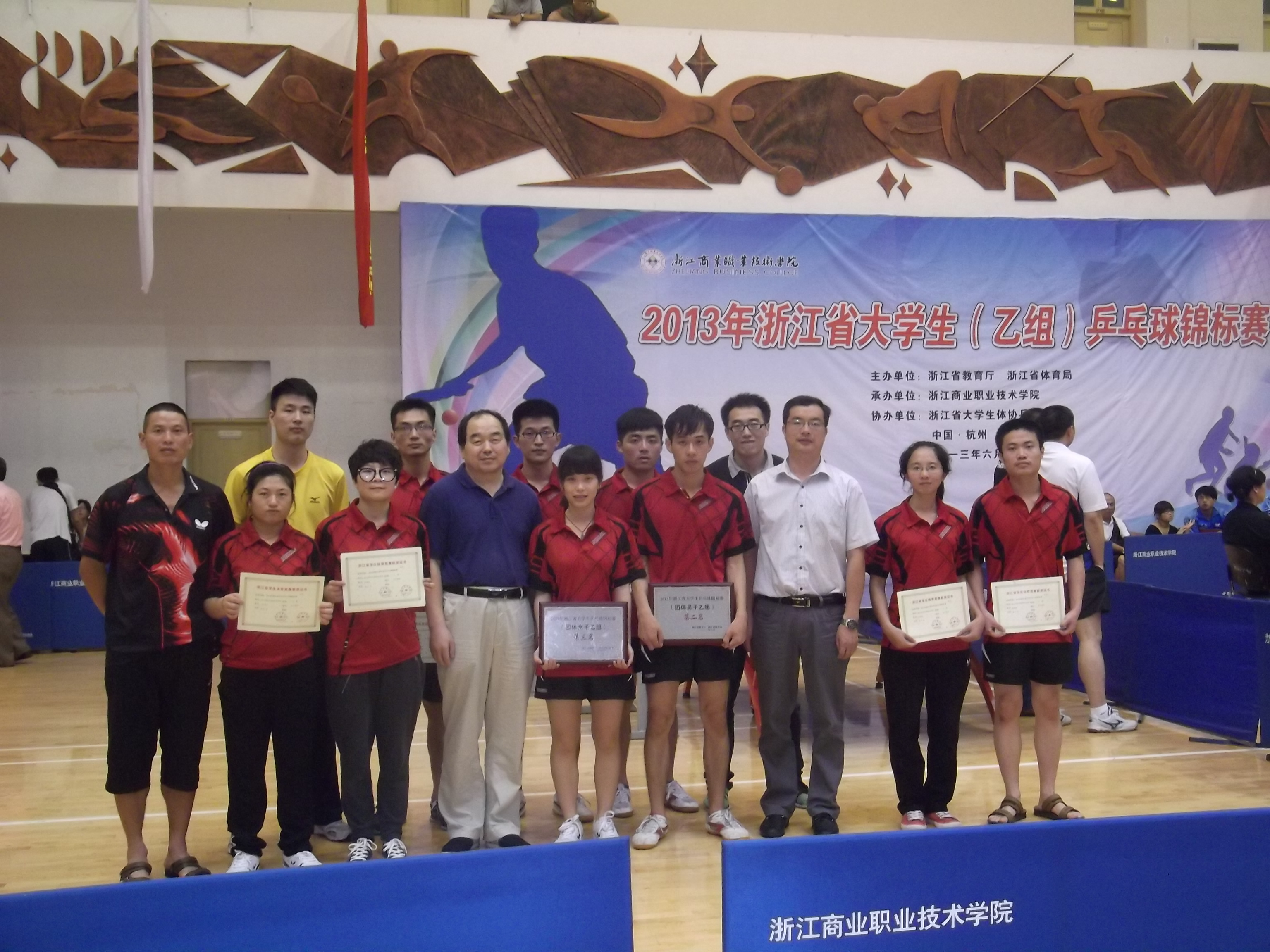 6月5日-9日,浙江省大学生乒乓球锦标赛高职高专组比赛在浙江商业职业技术学院举行,来自全省27所高职高专近200名乒乓球好手参赛。经过紧张激烈的角逐,我院代表队力挫群雄,夺得男子团体第二名、女子团体第三名、男子单打、双打银牌、混双打第五名、男子单打第五名等奖项,两名队员被评为优秀运动员。