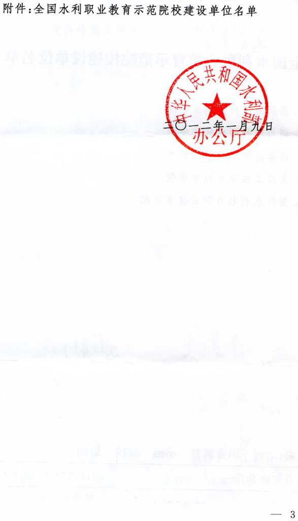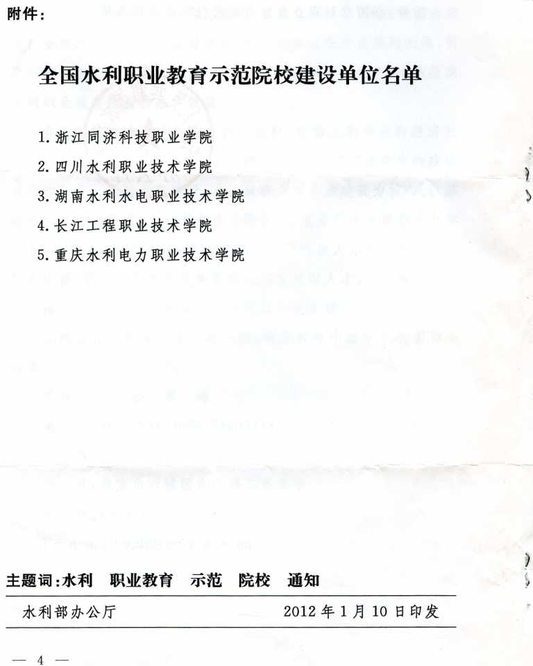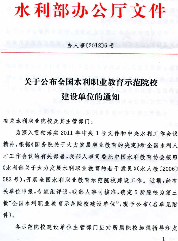 2012年1月9日,水利部办公厅《关于公布全国水利职业教育示范院校建设单位的通知》(办人事〔2012〕6号),确定了第三批共5所“全国水利职业教育示范院校建设单位”,我院名列其中。