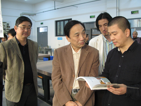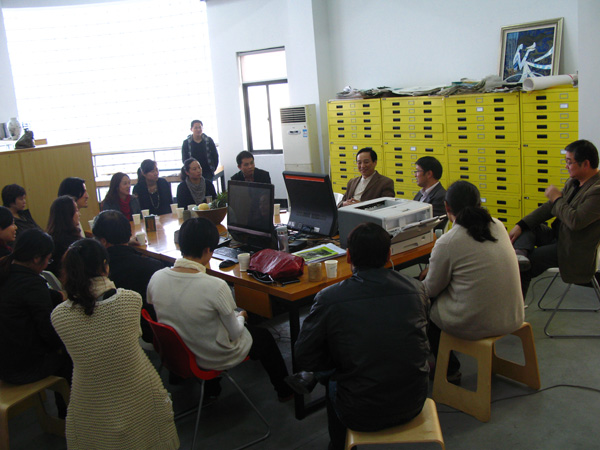 随后,在叶舟院长的陪同下,周旭教授与艺术系老师们进行了交流。艺术系副主任陈旭彤介绍了师资队伍、生源组成和专业建设、教学改革以及新专业申报设想等情况,并希望今后在专业建设、课程设置等方面多给予帮助和指导;不少年轻教师也畅所欲言,纷纷诉说了希望加快专业发展、提高教学质量的美好愿望。周教授对艺术系实行阶段制教学的改革举措给予了充分的肯定,认为这是提高艺术类专业教学质量的重大步骤;同时他又详细分析了目前国内的教学和艺术类相关行业发展的现状,对艺术系的专业建设、新专业申报等方面提出了指导性的意见和建议,并向艺术系赠送了他自己的二本力作《中国民间美术概要》和《浙江民间美术概要》。