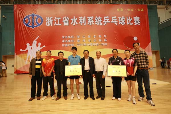 由浙江省水利厅举办,嘉兴水利局承办的全省水利系统乒乓球比赛于2011年10月25日-28日在嘉兴奥林匹克体育中心举行,来自全省十一个地市和直属单位21支代表队共225名运行员参加了本次比赛,我院代表队以工会主席刘志华为领队、章永健等七名运行员参加了全部项目的比赛,经过三天角逐,最终获得了男子团体第三、女子团体第五的好成绩;同时,沈逸获得男子乙组单打冠军、顾红伟获得女子乙组单打第八名、任立新获得女子甲组单打亚军、章永健获得男子甲组单打第七名。特此祝贺。