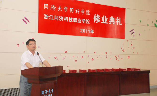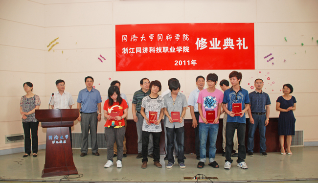 同科学院团委书记肖莉宣读了荣获同济大学同科学院优秀学员的名单,合作办学的各系领导和学生代表先后发言。同科学院人文艺术系主任朱静昌寄语同学们把握人生、感恩母校,我院建筑系党总支副书记于会泉鼓励同学们意气奋发、再接再厉。学生代表表达了对进修生活的不舍和对学校、老师的深深谢意。典礼上播放了2009级进修学生的校园学习生活集锦,将整个典礼气氛推向了高潮。与会领导向获得优秀学员的学生颁发了荣誉证书,向全体进修学生颁发了进修证书。