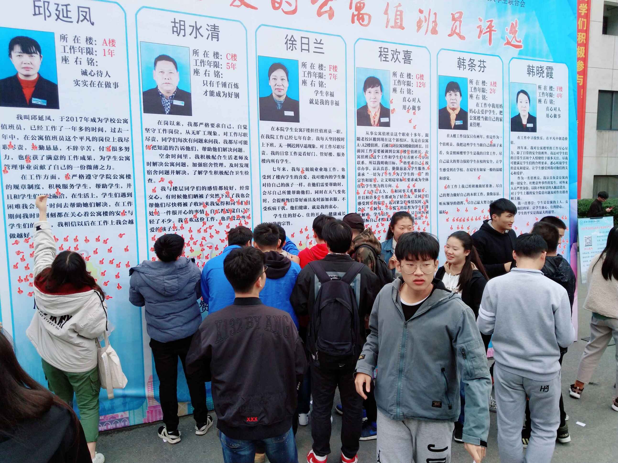 为了全面学习贯彻全国教育大会精神, 把立德树人的根本任务落到实处,切实发挥“三全育人”作用,后勤服务中心举办了2018年度“我最喜爱的公寓值班员”评选活动。全院2742名师生通过学院官方微信公众号投票、现场点赞等方式参与评选活动。最终程欢喜、胡水清两位公寓值班员被评为2018年度“我最喜爱的公寓值班员”,王自平、邱延凤等其他6名公寓值班员获积极参与奖。