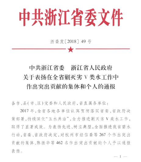 近日,浙江省委、省政府对在全省剿灭劣V 类水工作中做出突出贡献的集体和个人进行通报表扬,我校周鹏、施竣哲两位教师名列其中。