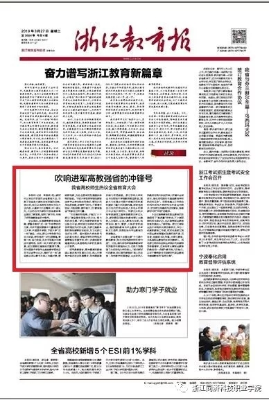 3月27日出版的《浙江教育报》以《吹响进军高教强省的冲锋号 我省高校师生热议全省教育大会》为题,报道了包括我校在内的多所高校师生的热议内容。
