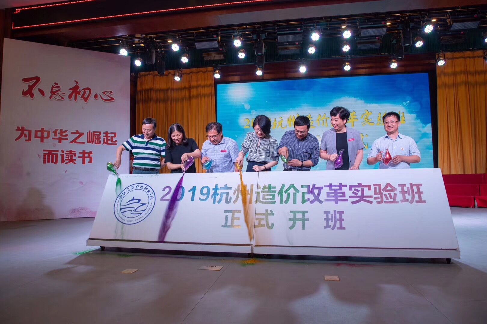 9月25日,2019杭州造价改革实验班开班典礼在学院瓯江楼小剧场举行。浙江省建设工程造价管理总站副站长韩英、杭州市城乡建设委员会市场处处长郭群、杭州市造价和投资管理中心主任袁旻、副主任秦嘉、杭州市建设工程造价管理协会书记陆开林,杭州工程造价产学研企业联盟理事长温运福,学院党委书记江影、学院院长梁国钱出席典礼,产学研联盟企业代表,以及学院教务处、发展合作处负责人,教师代表、实验班全体学生共计200余人参加开班典礼。学院党委委员、纪委书记应芬主持典礼。