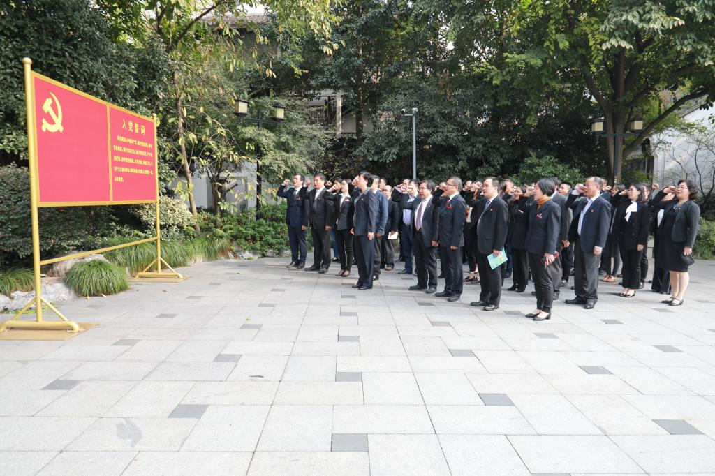 走出展厅,在党旗下,江影带领大家举行宣誓仪式,重温入党誓词。