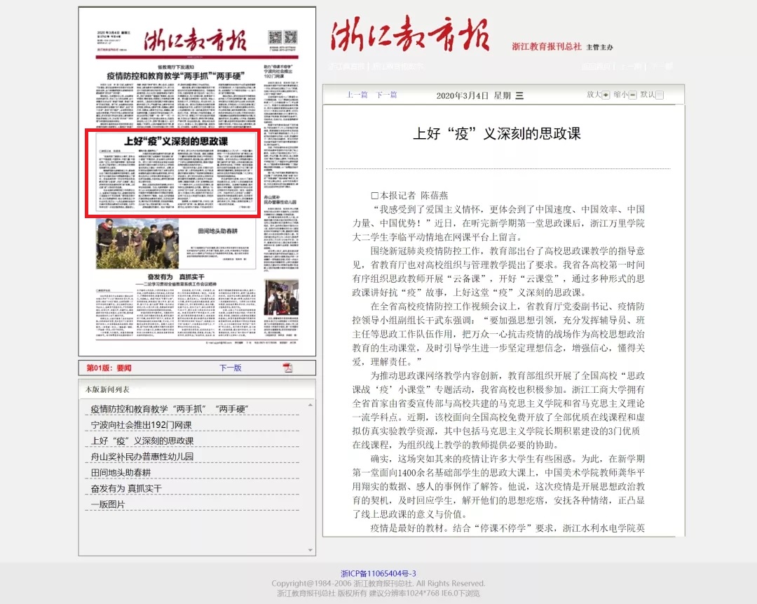 近日,《浙江教育报》在头版以《上好“疫”义深刻的思政课 》为题,报道我院结合疫情主题,通过多种形式的思政课讲好抗“疫”故事,上好这堂“疫”义深刻的思政课的事迹: