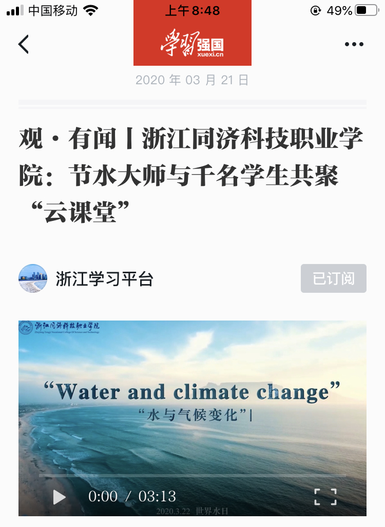 为了迎接“世界水日”“中国水周”的到来,学院积极联合萧山区五水共治办、乡镇小学等,积极发挥优势,利用信息化技术,将往年的水情宣传主题活动搬到了线上,以加强水资源保护,寻访美丽河湖为主线,开展了一系列主题活动。学习强国浙江学习平台和浙江在线网站等媒体都做了报道。