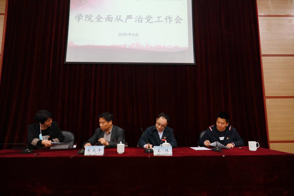 4月26日下午,学院召开2020年全面从严治党工作会,全体院校领导,科级以上干部,各党总支(直属支部)委员、各党支部书记、纪检委员,各部门(单位)兼职纪检监督员、特邀监督员共130余人参加会议。会议由党委副书记、院长梁国钱主持。