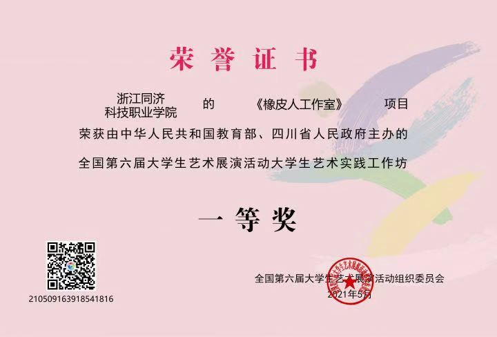 5月12日晚,由教育部和四川省人民政府主办的全国第六届大学生艺术展演活动在四川成都圆满落幕。由浙江省教育厅选送的我校两个项目《橡皮人工作室》艺术工作坊(指导老师:范子珍、戴瑞、李琦)和《基于工作室平台的现代学徒制艺术设计类工作室人才培养模式》美育改革创新优秀案例(指导老师:范子珍、戴瑞、章卉)分别获得大学生艺术实践工作坊一等奖和全国高校美育改革创新优秀案例二等奖。全国大学生艺术展演活动每三年一届,本专科同台竞技,至今已举办六届,这也是我校首次在全国艺术展演活动中获奖,实现了我校在全国大学生艺术展演活动中一等奖零的突破。