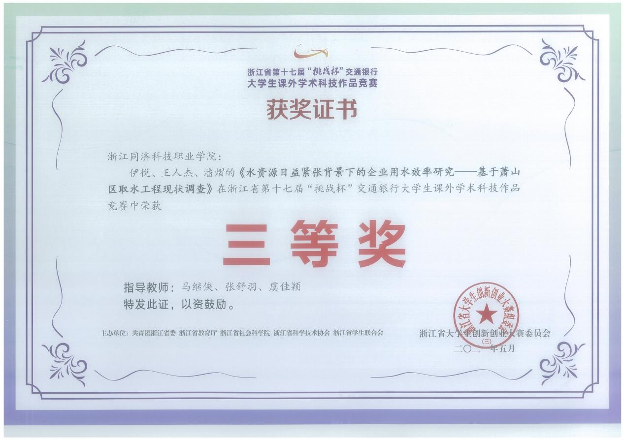 本次大学生课外学术科技作品竞赛对象包括浙江大学在内的本科学校和职业院校项目同赛道竞技,竞争非常激烈。我校艺术设计学院刘益曦、周圆圆、黄君老师指导的《基于未来社区理念下老旧小区现状、问题、改造对策研究——以温州市瓯海区为例》晋级决赛并荣获二等奖。另外,建筑工程学院周培娇、蒋晓冬、郑传娟指导的《一种用于建筑工地喷雾降尘的联动装置》,水利工程学院张舒羽、马继侠、虞佳颖指导的《奇观·情怀·精神——海宁潮文化调查报告》,水利工程学院胡玉珊、屈兴红、陈福运指导的《浙江省山区农饮水水质状况调查分析——基于浙江省400余个农村供水工程的调研》,水利工程学院姚悦铃、曾瑜、厉莎指导的《让土地不再口渴——高效节水的防渗漏雨水收集装置》,经济与信息学院李爱红、王志远、徐骏骅指导的《传承非遗文化赋能乡村振兴:桐乡蓝印花布印染技艺传承与发展调查研究》,水利工程学院马继侠、张舒羽、虞佳颖指导的《水资源日益紧张背景下的企业用水效率研究——基于萧山区取水工程现状调查》等6个项目获得大赛三等奖。