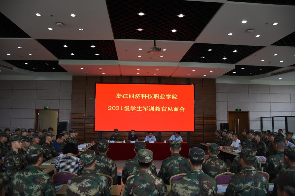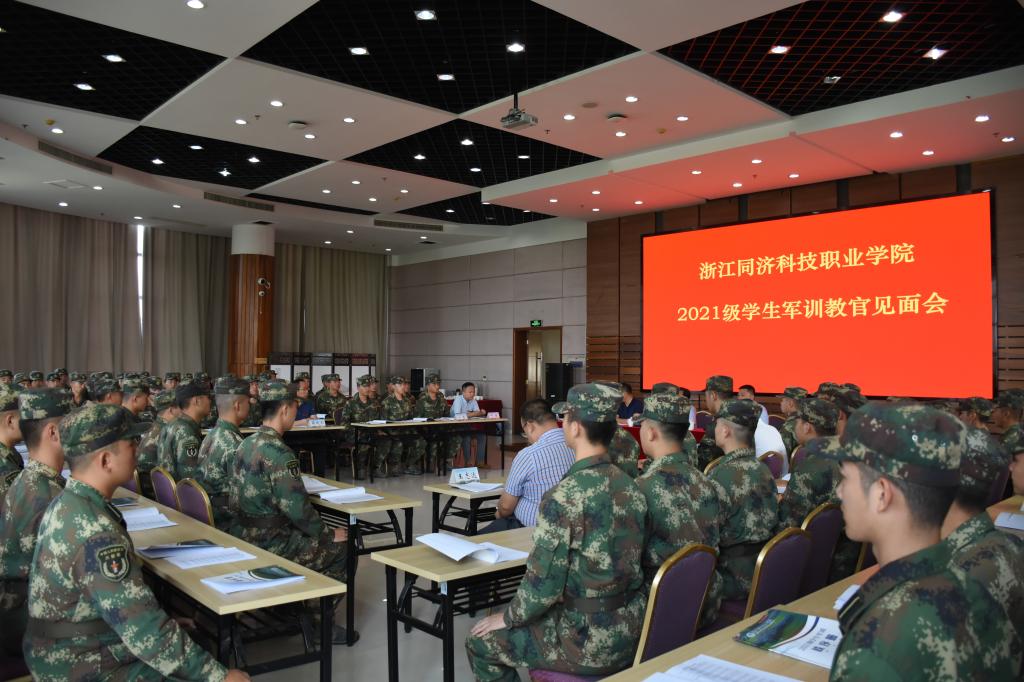 9月19日下午,学校在行政楼三楼多功能厅召开2021级新生军训教官见面会。校长梁国钱出席会议并讲话,承训单位浙江建设职业技术学院士官学院院长陈志峰,伊文和113名教官,各二级学院党总支负责人、军训辅导员参加见面会,见面会由副校长朱兆平主持。