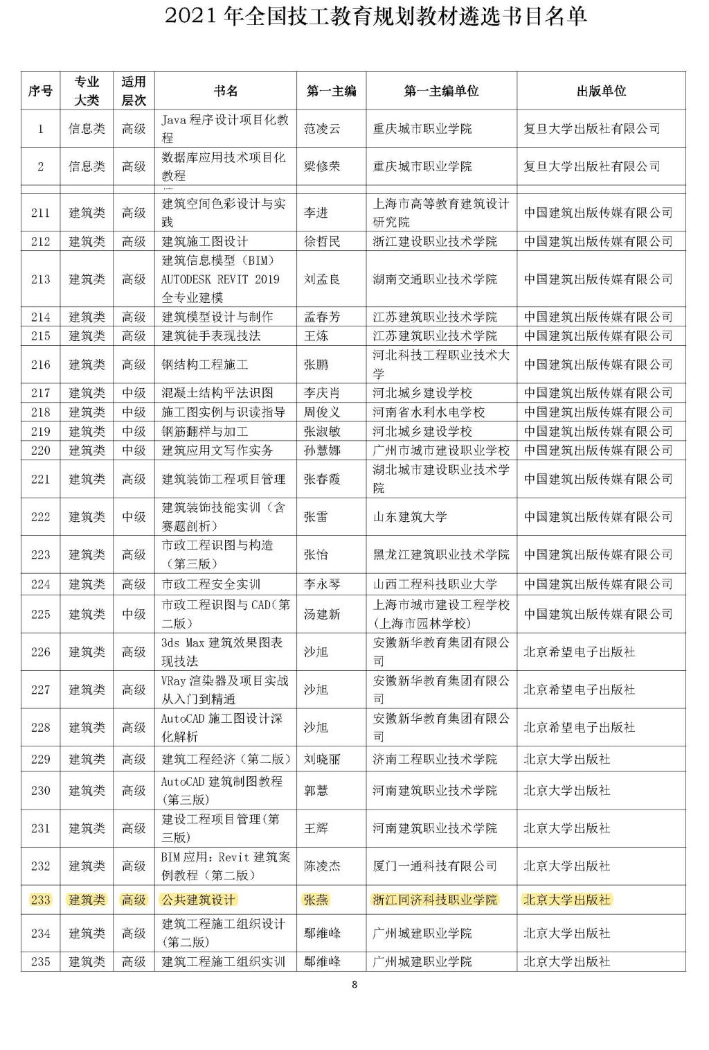 近日,人力资源和社会保障部公布了2021年全国技工教育规划教材遴选结果:艺设学院张燕副教授主编,傅丹侠高工参编的《公共建筑设计》突出重围,成功入选。