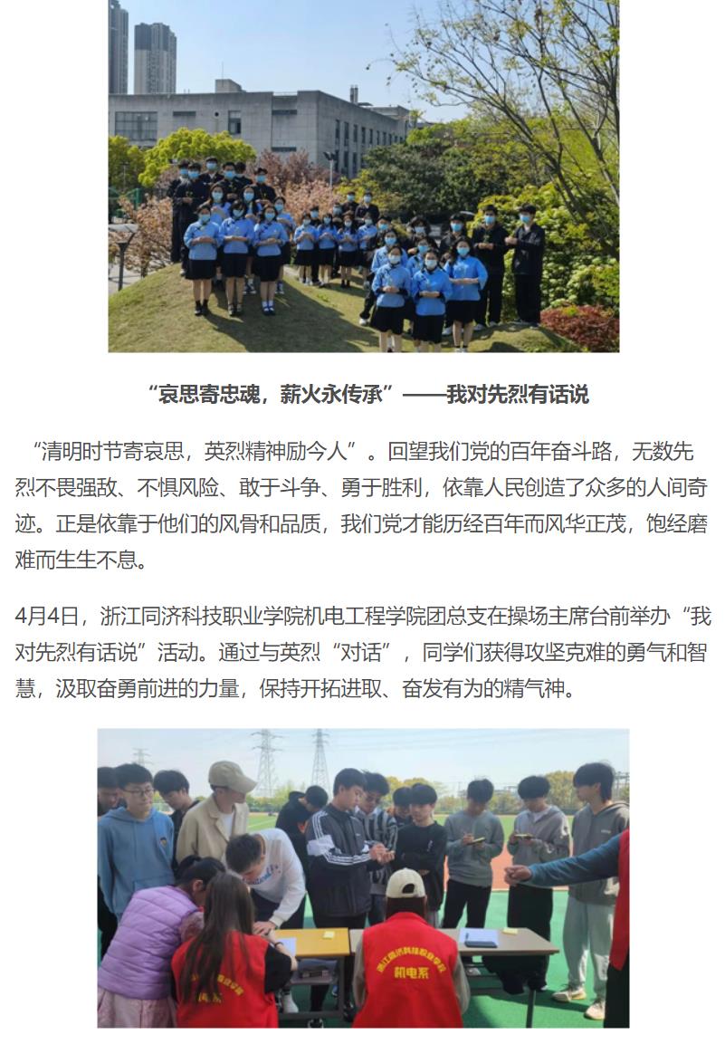 疫情当下,守护学生安全是头等大事,在清明节假期间组织系列主题教育活动的开展,丰富学生课余生活,共筑机电之家的温馨育人环境,进一步激发了同学们爱党爱国爱社会主义的青春热情。通过活动,同学们深刻体会到当下幸福生活的来之不易,立志要努力学习,为实现中华民族伟大复兴贡献自己的一份力量!相信新时代的机电青年们必将汇聚起不可战胜的磅礴力量,在新征程上慨然前行!