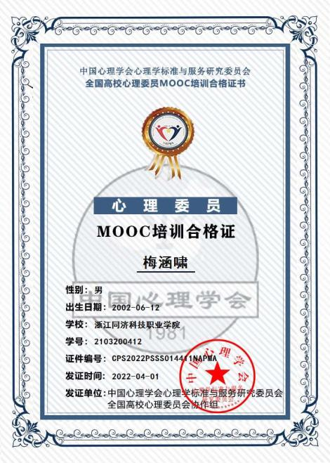 本次培训主要通过线上的方式进行学习和测评,学习内容主要包括心理委员的角色和定位、常见心理问题的症状及识别、情绪问题、压力管理等14个专题,学习完成并通过测评后获得心理MOOC培训证书。本次培训共有281名同学参与,在校班级达到全覆盖。