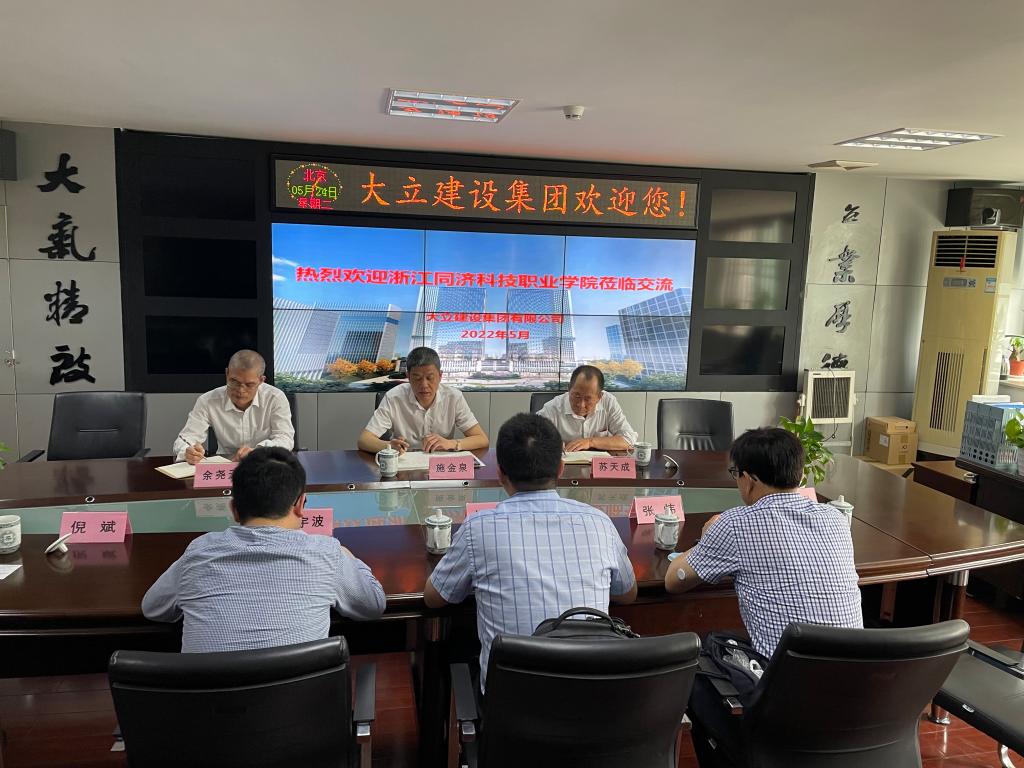 2022年5月24日下午,建筑工程学院院长杨海平、建筑工程技术专业部主任竹宇波、建设工程管理专业部主任张炜一行来到大立建设集团有限公司开展合作交流,该公司常务副总裁施金泉、总工程师余尧天等接待了学院一行。